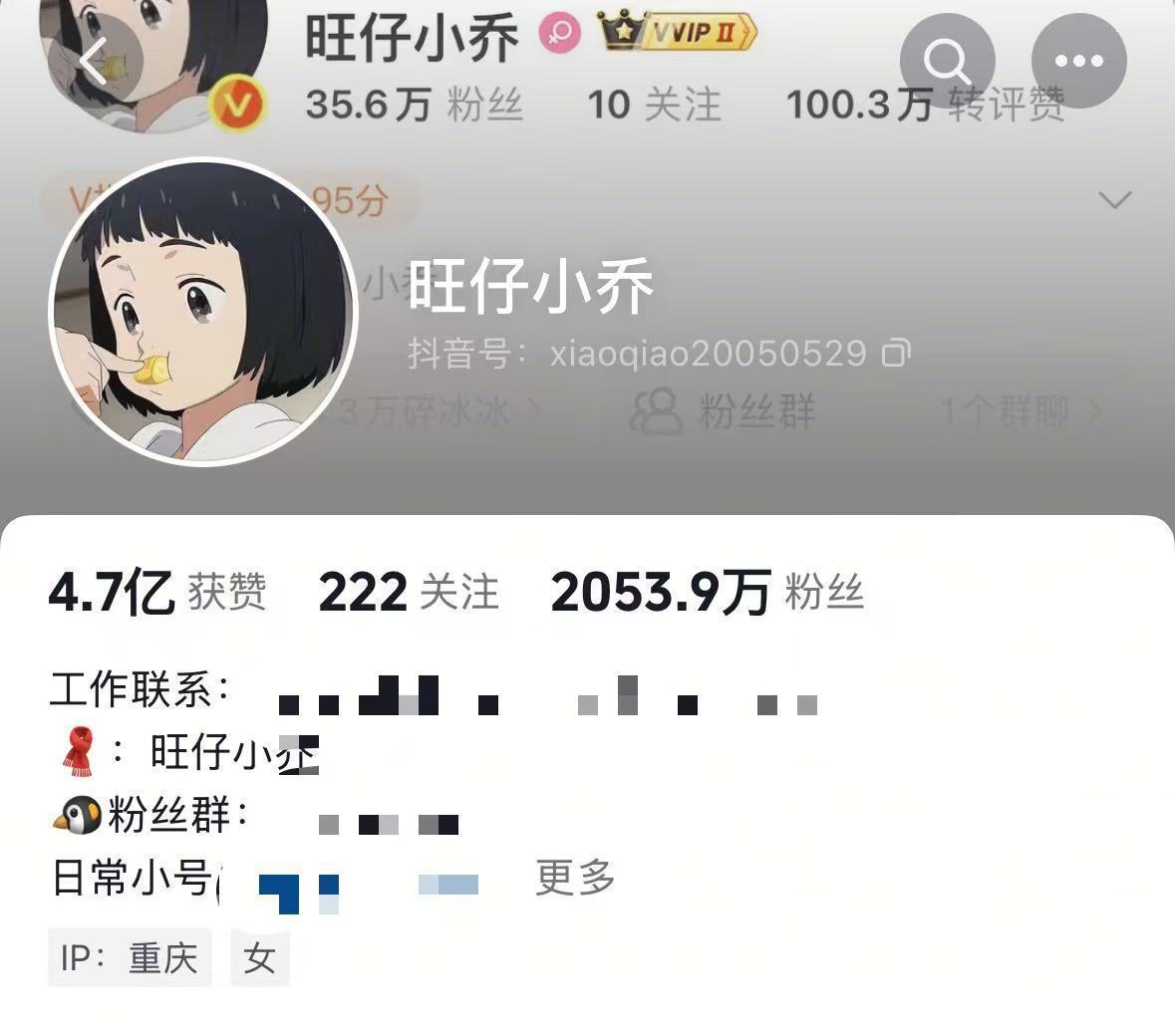 截至发稿前,旺仔小乔抖音粉丝为2053.9万,此前粉丝数为2344万,已掉粉290万。