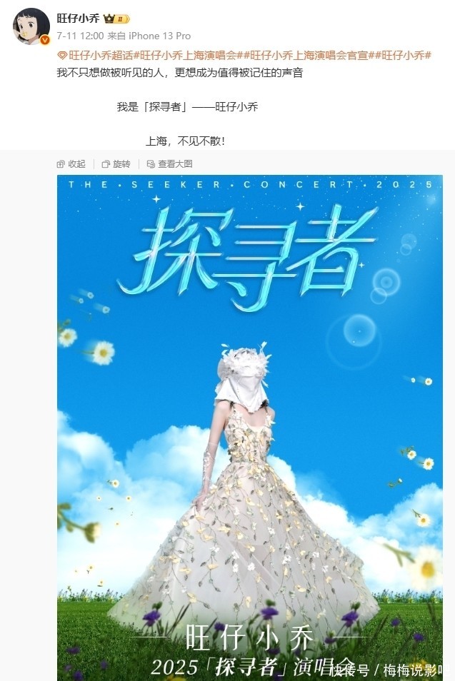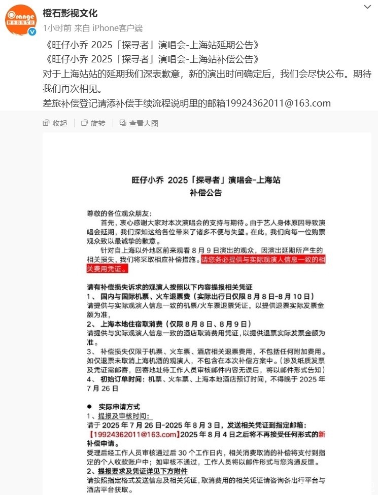 同日晚,@橙石影视文化发布旺仔小乔 2025「探寻者」演唱会-上海站延期与补偿公告。