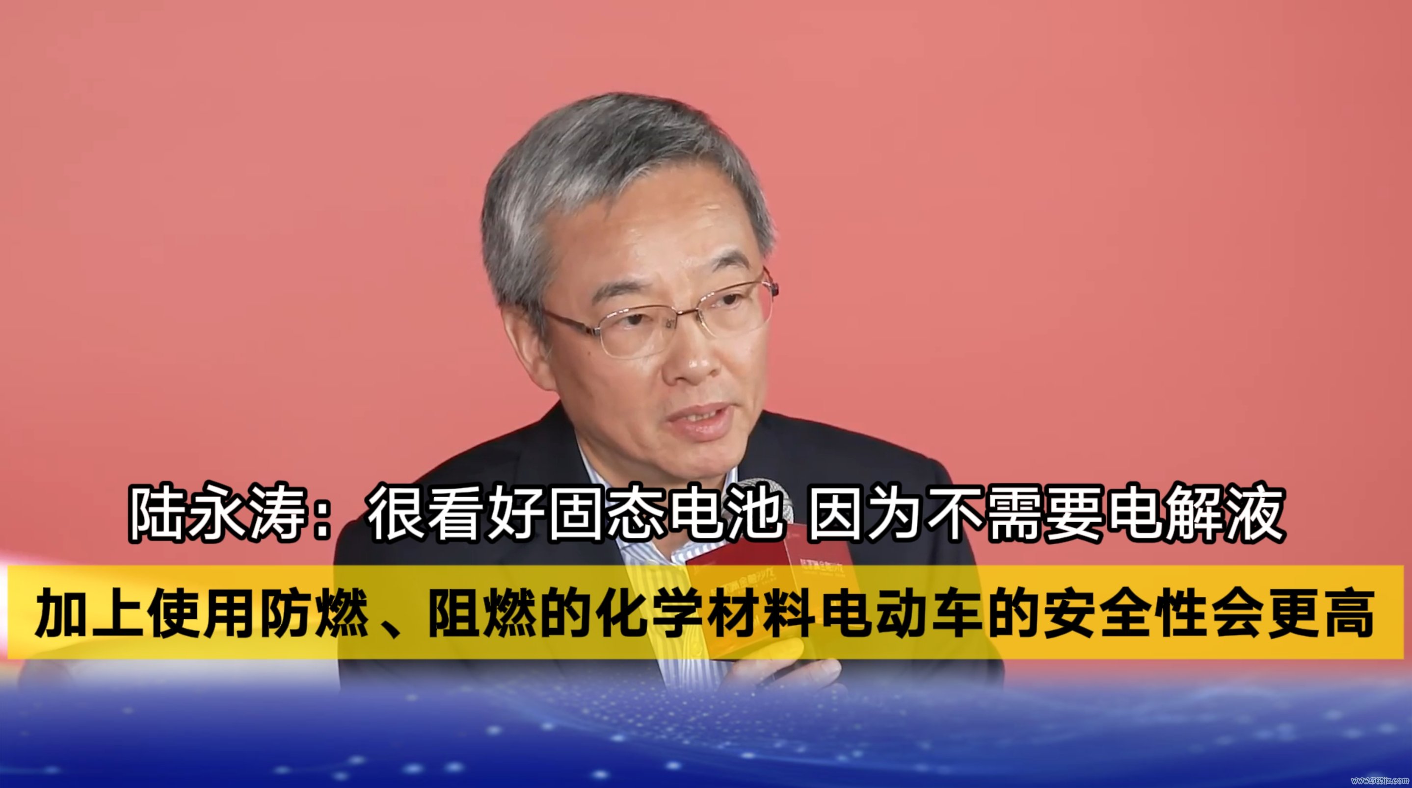 00'47'' 陆永涛:很看好固态电池 因为不需要电解液 加上使用防燃、阻燃的化学材料 电动车的安全性会更高